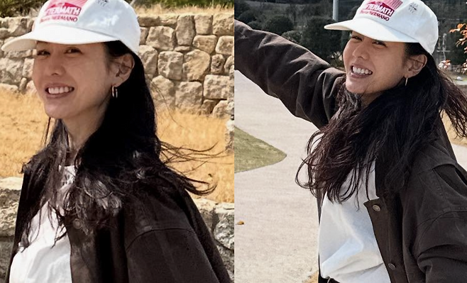 사진 속 손예진은 화이트팬츠에 브라운 자켓을 매치한 세련된 봄 패션을 선보였습니다.