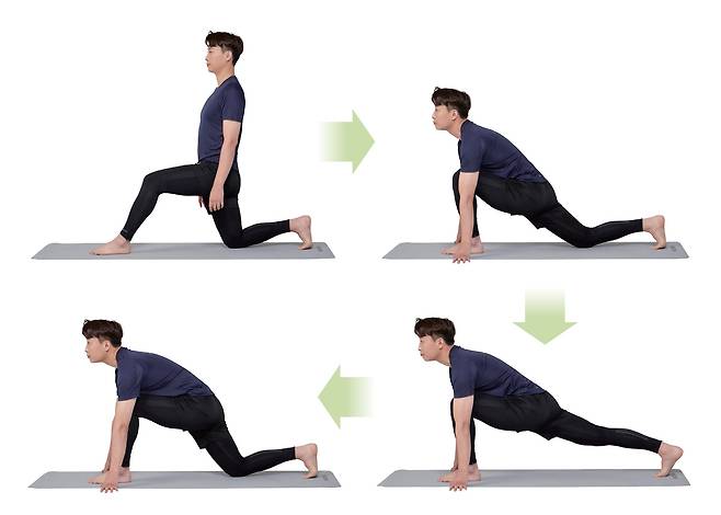 왼쪽 무릎을 세우고 오른쪽 무릎은 바닥에 닿도록 구부려 앉습니다. 왼발을 한 걸음 앞으로 내딛어 자세를 안정적으로 잡아줍니다. 왼발을 몸의 중심에 두고 양손으로 바닥을 짚은 뒤 상체의 체중을 앞으로 실어줍니다. 이때 허리는 곧게 세우고 시선은 정면을 바라보며 엉덩이를 아래로 내려줍니다. 엉덩이를 아래로 내리면 오른쪽 허벅지 앞쪽에서 골반까지 이어지는 장요근이 점차 늘어나는 것을 느낄 수 있습니다. 정면을 바라보는 동작은 엉덩이의 위치를 안정적으로 유지하는 데 도움이 됩니다.