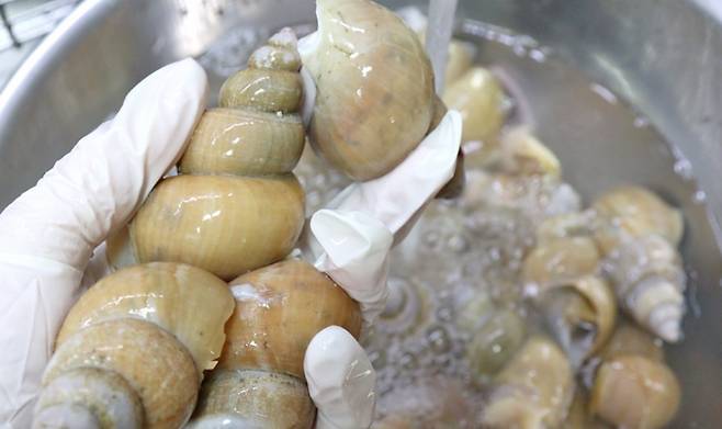 바다 고둥은 껍질이 얇고 약하기 때문에 깨진 조각들을 잘 씻어내는 게 중요해요. 잘려나간 조각들이 날카로우니 손질시 꼭 장갑을 착용해 주세요.