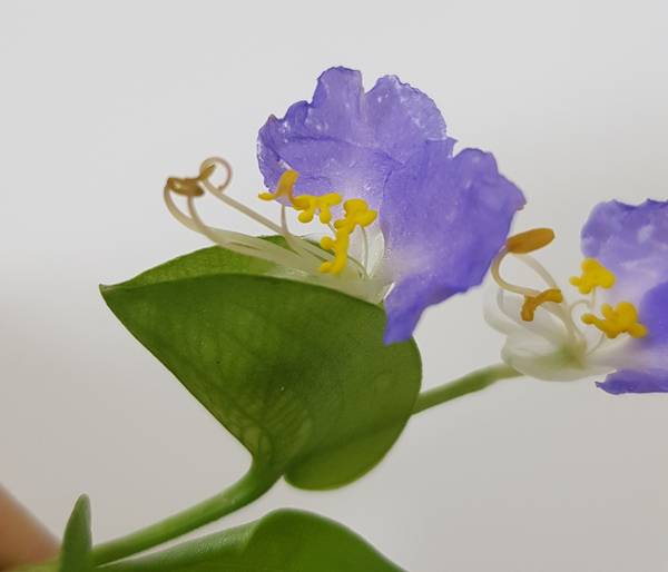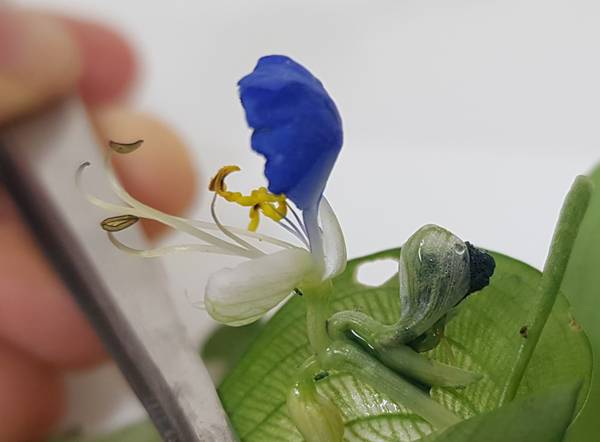 닭의장풀의 꽃은 지금 이 시기인 8월 초에 푸른색 꽃을 피워요. 가끔 보라색을 띠는 꽃도 핀답니다. (이 푸른색 꽃잎은 천연염료라고 해요.) 닭의장풀의 꽃은 푸른색 꽃잎 2장으로만 이루어졌다고 생각하기 쉬워요. 하지만 자세히 보면 아래쪽에 투명에 가까운 백색 꽃잎이 4장 있어요. 그리고 암술 하나와 수술 6개가 있는데요, 실제로 꽃가루가 있는 진짜 수술 3개와 4개의 가짜 수술로 이루어져 있어요. 진짜 수술 중 2개는 암술이 다른 꽃의 수술과 수정하지 않으면 스스로 수정하기 위해서 암술과 같이 길게 뻗어있어요. 꽃은 한 불염포 당 한 송이가 피는데, 간혹 2송이가 한꺼번에 피는 개체도 있어요.