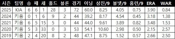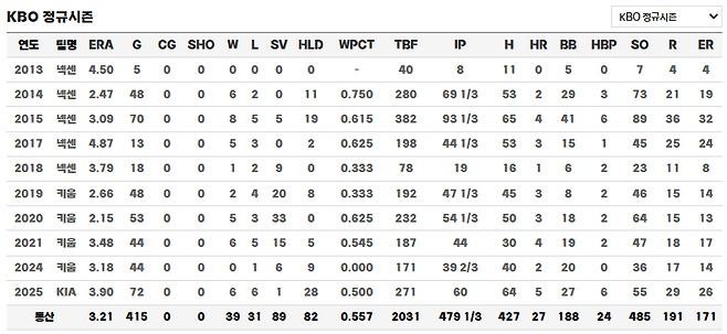 WAR(대체선수 대비 승리 기여도) 0.84라는 수치는 그가 더 이상 리그를 지배하는 'S급' 불펜이 아님을 냉혹하게 증명한다.