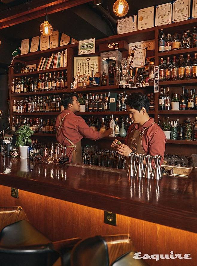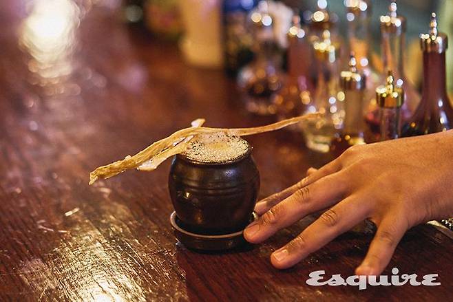 장생건강원이라는 공간의 단초는 서정현 사장의 이력에서 나왔다. 그의 정체는 국내 유수 특급 호텔의 바에서 두루 근무하고 세계대회에 국가대표로 출전한 바 있는 실력파 바텐더. 그리고 대한민국 전통주 홍보대사다. 그는 ‘서울 셀렉션’을 비롯한 다양한 시도를 하며 전통주 칵테일 분야에 애정과 자부심을 갖게 되었고, 윤상엽 사장과 의기투합해 처음 바를 차리기로 했을 때도 ‘전통주’와 ‘시장’이라는 키워드로 새로운 분야를 개척하고자 했다. 그리고 또 하나의 단초는 그렇게 계약한 강남 영동시장 매물의 간판에서 나왔다. 그 자리에서 지난 20년 동안 운영되었던 한약방 ‘장생건강원’의 간판에서. 두 사장은 철거 직전에야 간판에서 새로운 영감을 얻었고, 상호를 그대로 계승하기로 했다. ‘헬시 푸드’라는 키워드도 함께. “갑자기 좋은 아이디어가 떠오른 거죠. 제가 인삼, 도라지 같은 재료로 칵테일을 만들어오기도 했으니 건강원 콘셉트의 바를 한번 해보면 좋겠다고. 사실 저희 같은 바텐더들에게는 어떤 재료로든 칵테일 맛을 잡을 수 있다는 자신이 있거든요.” 그래서 장생건강원의 메뉴판은 이런 문구로 시작한다. “먼저, 20년간 이 자리를 꾸준히 지켜온 노부부의 노고에 진심으로 감사드리며, 장생건강원은 전통 시장의 상생과 공생을 목적으로 건강원 콘셉트에 적합한 신개념 음료를 선보입니다.” 여기서 ‘상생’이란 젊은 층의 시장 유입으로 인한 활성화 같은 막연한 기대 효과를 말하는 게 아니다. 장생건강원은 영동시장 상인들과 실질적인 협업을 도모한다. 재료의 많은 부분을 영동시장에서 사오기도 하거니와, 백미는 ‘마켓 컬래버레이션’이다. 매달 시장 안의 가게 하나씩을 선정하고 협업해 새로운 창작 칵테일을 선보이는 것이다. 해산물 가게, 참기름집, 냉면 가게, 김밥 가게에 이르기까지. “웃기다고 할지도 모르겠는데, 그게 실제로 효과가 있어요. 만약에 빵집과 협업해서 칵테일을 만든다, 그러면 손님들이 돌아가는 길에 빵을 사가는 거죠. 하루에 5개씩 팔리던 게 몇십 개 팔려요.” 장생건강원 맞은편에 2호점을 내서 커피와 붕어빵을 파는 이유도 궁극적으로는 시장 ‘어머니 아버지들’과 교류하기 위해서라고 했다. 그리고 ‘굳이 그렇게까지 친분을 쌓는 이유는 더 나은 협업을 위해서인가’ 물었을 때는 이런 답을 내놓기도 했다. “그런데 그건 어떤 목적을 위해서가 아니라 당연히 해야 하는 거죠. 우리가 시장 안의 일원으로 함께 어울려야 하잖아요. ‘굳이’가 아니라 ‘무조건’이라고 생각해요.”