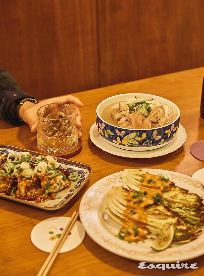 4시까지 영업하거든요. 그러다 보니 영업을 마친 주변 상인들이 와서 술을 마시는 경우가 많아요. 메뉴에도 시장 식재료가 반영되는 부분이 많고요.” 촬영을 위해 부려놓은 음식에도 좋은 예시가 있었다. 시장 순대를 튀겨서 만든 ‘깐풍순대’나 족발과 오겹살을 넣어 만든 ‘마감국수’ 같은 것들. ㅆㅎㅍ이 추구하는 요리의 정체는 무국적 요리이며, 모토는 ‘해장’이다. ‘안주로 해장하면서 계속 술을 마실 수 있게 만들자.’ 메뉴판부터 분위기, 안주까지 ㅆㅎㅍ은 머무는 내내 ‘이 가게 주인장들 정말 술 좋아하는구나’ 저절로 감탄하게 되는 주점이다. 그럼에도 굳이 첨언하자면, 30분의 인터뷰 동안 두 사장은 “저희가 술을 정말 좋아한다”는 말을 다섯 번 넘게 했다.