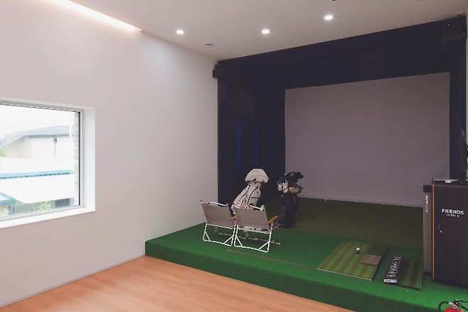 현관이 포함된 가장 큰 매스는 손님을 맞이하면서 취미생활을 함께 즐기는 공간으로 구성했다. 1층에는 거실, 2층에는 골프연습실(멀티룸)을 배치했다. 매스의 높이와 길이를 확장해 다양한 활동을 위한 내부 공간을 충분히 확보하도록 설계했다.
