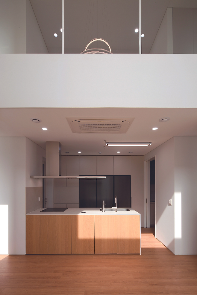 중간 매스는 건축주 아내 분이 손님들을 맞이하는 상대적으로 차분한 공간이다. 즉, 차를 마시고 다과를 즐길 수 있는 공간으로 1층에는 주방, 식당을 배치했다. 식당의 상부를 오픈해 2층 가족실과도 연계함으로써 개방감과 쾌적성을 동시에 제공한다. 식당은 1층 거실과의 연계도 고려했다. 공간은 명확하게 분리돼 있지만 서로 마주보는 방향으로 넓은 창을 내어 각각의 공간과 연계된다.