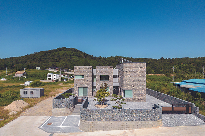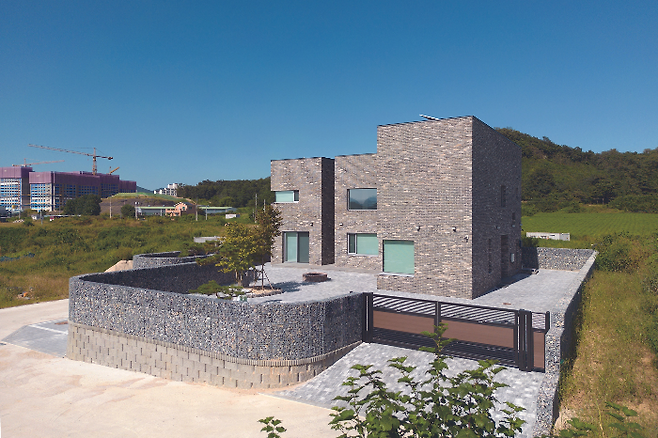 대지는 앞서 밝힌 바와 같이 전체적으로 높게 조성돼 있어 여러 방향으로 전망이 좋은 조건을 갖고 있었다. 하지만 전 방향으로 좋은 전망을 누릴 수 있는 개방된 대지 조건은 프라이버시 보호에 취약하다는 약점도 갖고 있다. 이를 보완하기 위해 개비온 담장과 대문을 활용해 프라이빗한 공간으로 조성했다.