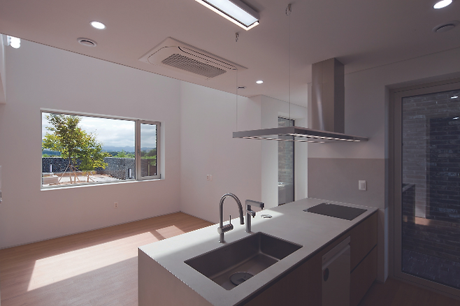 ‘사이사이’의 건축 계획은 공간 이용자를 건축주 부부와 손님으로 구분하는 데 중점을 뒀다. 우선, 건축주의 주차공간을 손님의 주차공간에서 분리하는 것부터 시작했다. 손님의 주차공간은 옹벽 아래에 구획한 반면, 건축주의 주차공간은 건물 옆에 계획했다. 건축주가 불필요한 동선 없이 바로 현관을 드나들 수 있도록 편의성을 확보한 것이다.