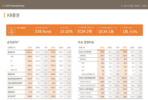 KB증권이 올해 상반기에도 안정적인 성과를 시현가며 대형 증권사로서의 입지를 굳혔다. 순이익은 3295억원으로 전년 동기 대비 12% 줄었지만 영업순수익 커버리지는 181.9%를 기록해 여전히 비용 대비 수익 창출력이 높았다. 부동산 프로젝트파이낸싱(PF) 손실 인식으로 순익이 감소했음에도 투자중개, 자산관리(WM), 기업금융(IB), 운용 등 전 부문에서 고른 성과를 거둔 점이 특징이다.