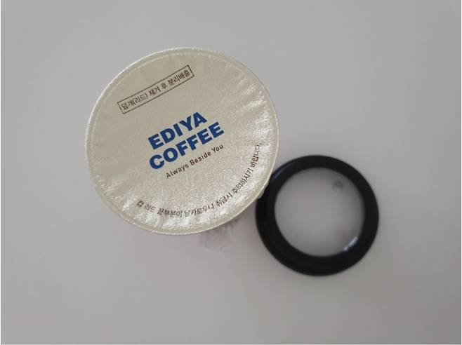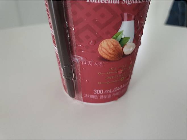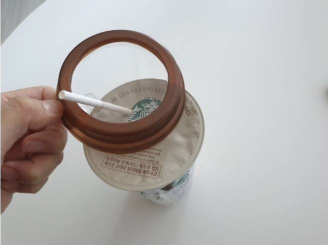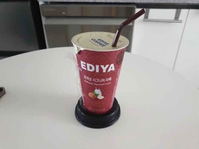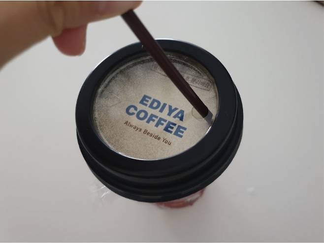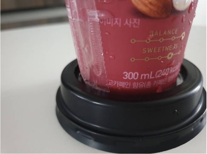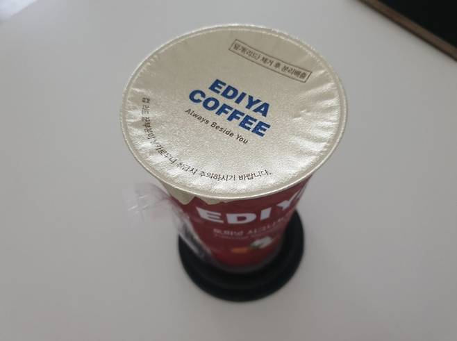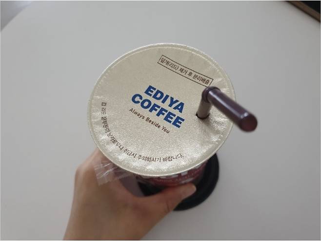 그리고 뚜껑을 테이블에 올려두고 그 위에 컵커피를 올려주세요