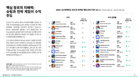 인도에서는 시뮬레이션, 아케이드, 퍼즐과 같은 장르와 문화적으로 공감대를 형성하는 테이블톱 보드게임이 인기를 끌었다. 인도의 가족 중심 게임 문화에 맞는 간단하고 친숙한 게임 플레이 덕분에 높은 다운로드 수를 기록했다. 반면 인앱 결제 수익은 깊은 몰입감, 전략적 요소, 소셜 기능이 결합한 슈팅, 카지노, 전략 등 경쟁이 치열한 장르가 주도했다.