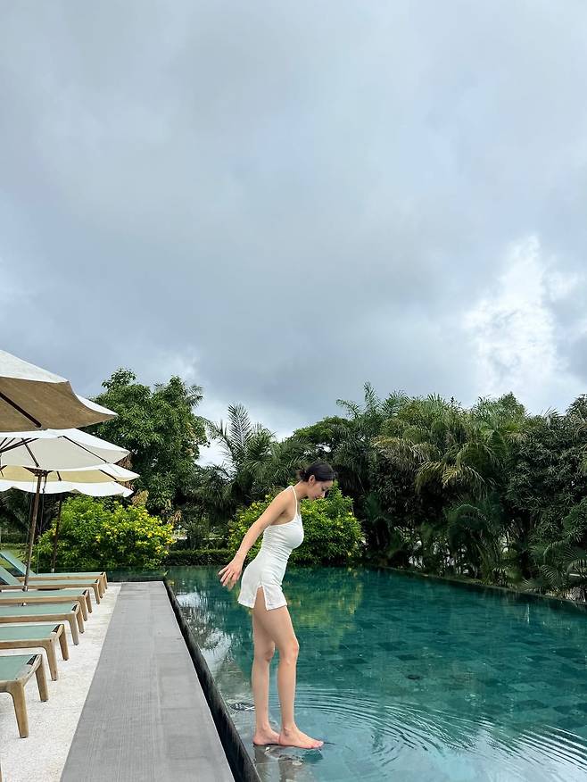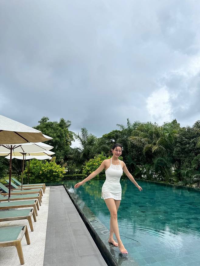사진 속 그는 화이트 레이스 디테일의 원피스형 수영복을 입고, 탄탄한 몸매와 청순한 분위기를 동시에 뽐내고 있다.