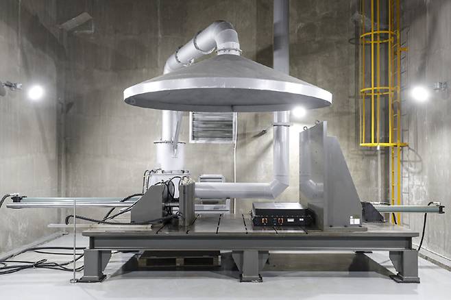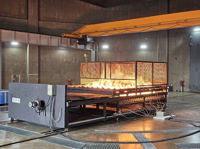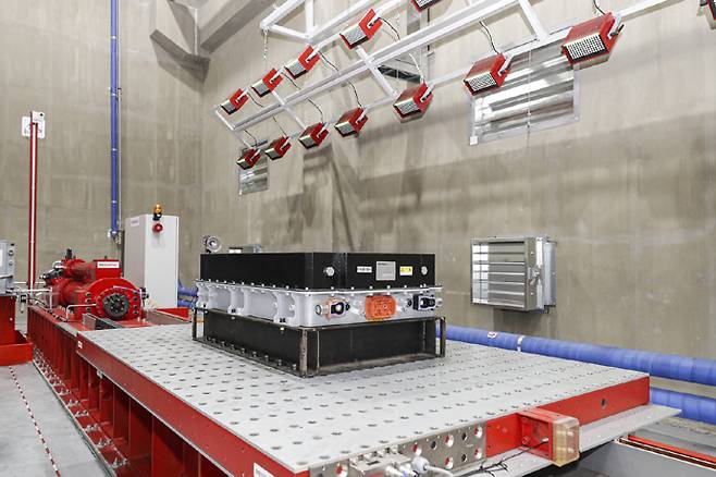 친환경 자동차 부품인증센터는 개관 전날 실험을 통해 배터리의 발화 상태를 직접 확인할 수 있는 실험을 시연했다. 통상 휘발유로 불을 지피는 실험과 달리 LPG가스를 연소시키는 것이 특징이다. 이 때 연소 온도는 섭씨 800~1,100도에 달한다. 이 상태로 2분 30초 간 배터리의 발화 및 전이 상태를 확인한다.