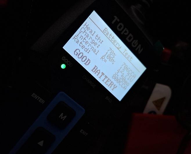 구매한지 하루만에 도착해서 바로 뜯어서 내려가서 측정해 봤네요. 운행 마치고 3시간 경과 후의 차량 배터리 측정 결과인데 다행이 충전율은 100% 나오네요. 다만 배터리 구입한지 3달 정도 됐는데 SOH가 78% 라니...