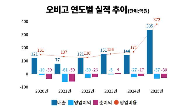 다만 빠른 외형 확장과 함께 비용 부담도 커지고 있다. 지난해 매출은 카랑 실적이 반영되며 전년 대비 132.5% 증가한 335억원을 기록했다. 반면 영업손실은 37억원, 순손실은 30억원으로 적자 폭이 확대됐다. 영업비용이 전년 대비 171억원에서 373억원으로 크게 늘었지만 카랑 인수 이후 기존에는 없던 상품매출원가와 서비스매출원가가 새롭게 반영된 영향으로 풀이된다. 다만 오비고는 공시상 확인되는 2019년 이후 영업적자에서 벗어나지 못하고 있다.