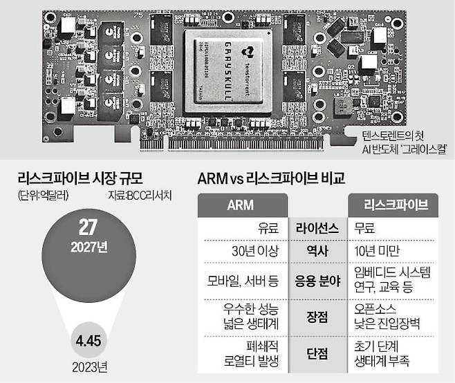 저전력·저비용으로 맞춤 설계를 지원하는 ‘RISC-V’ 아키텍처가 인공지능(AI) 반도체 패권을 가를 새로운 무기로 떠오르고 있다. 국내 대기업들은 앞다퉈 이 분야 선두로 꼽히는 캐나다의 텐스토렌트와 협력을 강화하며 우군 확보에 나섰다.