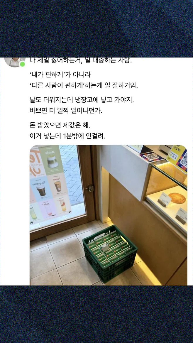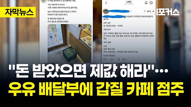 사건의 시작점은 점주 A씨의 개인 소셜미디어(SNS) 계정이었다. A씨는 매장 바닥에 배송된 우유 박스 사진을 촬영해 올리며 배달원을 향해 날 선 비난을 쏟아냈다. "냉장고에 넣고 가야지. 돈 받았으면 제값은 해라"라는 그의 발언은 직무 범위에 대한 기본적인 이해조차 결여된 갑질의 전형이었다. 통상적으로 식자재 배송 기사의 역할은 매장 지정 장소까지의 하차 및 전달이며, 이후 냉장고 진열 등 상품의 관리와 보관은 전적으로 매장 측, 즉 점주와 직원의 고유 업무다.
