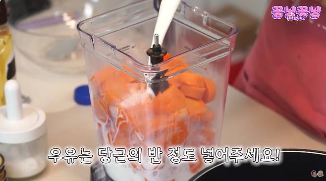 삶은 당근, 우유, 소금 약간을 믹서기에 넣고 곱게 갈아줍니다. 이때 너무 묽지 않도록 우유 양을 조절해 주세요.
