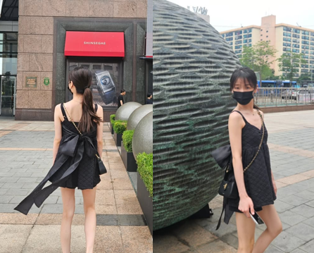 슬림한 어깨 끈과 미니 기장, 체인백을 매치한 스타일은 시크하면서도 러블리한 무드를 동시에 풍겼고, 블랙 마스크와 포니테일 헤어로 깔끔함을 더했다.