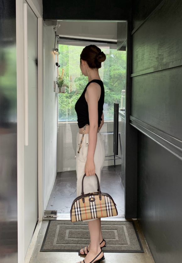 차정원이 들고 나온 버버리 ‘하이랜드 볼링 백’은 면 린넨 혼방 소재에 송아지 가죽 트리밍을 더해 고급스러운 분위기를 자아낸다.