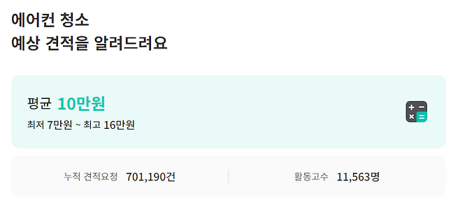 숨고 내에서 거래되는 에어컨 청소 평균 비용은 건당 10만 원입니다. 최저 비용은 7만 원, 최고 비용은 16만 원으로 책정되어 있어요.
