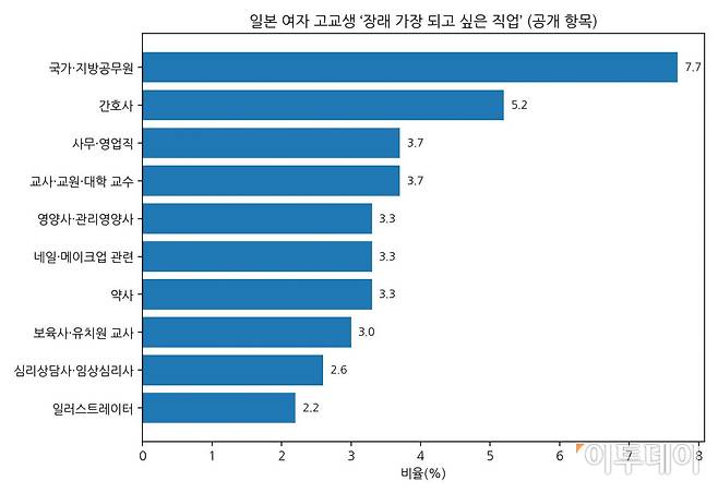 여자 고교생은 1위 공무원 다음으로 간호사(5.2%)를 꼽았다. 이어 대학 교수(3.7%)와 사무·영업직(3.7%), 약사(3.3%) 등이 뒤를 이었다.