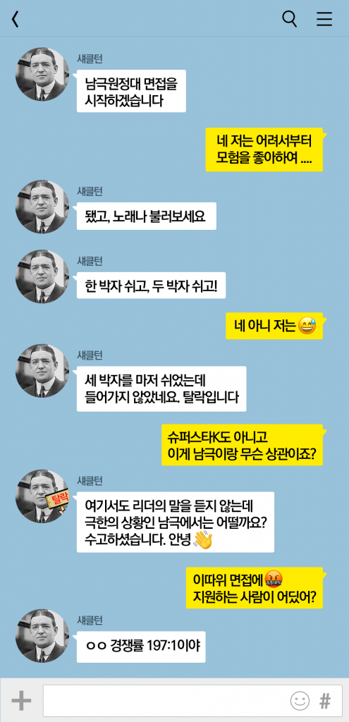 이건 무슨 원양어선을 태우겠다는 것도 아니고(더 심한 모험이기도 하다), 신고를 해도 모자랄 것 같은 이 솔직한 공고는 많은 영국인들의 심장을 뛰게 만들었다. 무려 5천 명이 넘는 지원자가 몰렸는데, 섀클턴은 면접에서 노래를 부르게 시킨 것으로 유명하다. 압박면접, 아니 어떤 상황에서도 대장의 명령을 따르는지 혹은 당황스러운 상황에서의 멘탈을 보기 위해서였다.