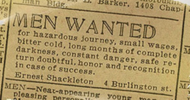 “구인공고 : 어렵고, 보수도 적고, 혹한의 추위, 몇 달간 지속되는 어둠, 계속되는 위험과 안전한 귀환을 보장하지 못하는 모험. 성공할 시 영광과 명예를 얻을 수 있음 <어니스트 섀클턴, 뷰링턴 가 4번지>”