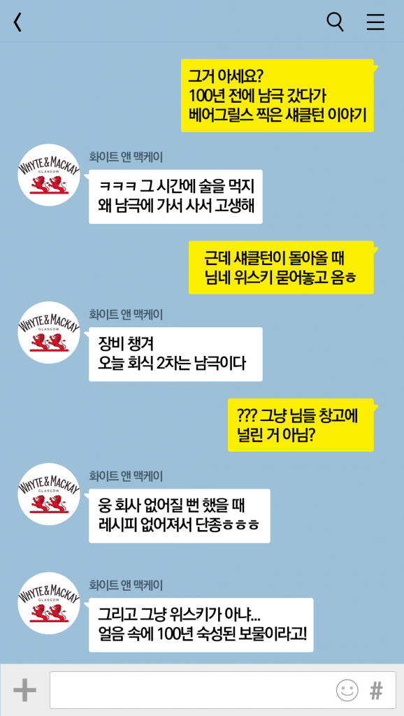 단순히 마시고 즐기는 위스키에도 수많은 모험과 사연이 담겨있다. 미지의 세계와 낭만을 담은 섀클턴 위스키는 많은 사람들에게 그들의 무용담을 던져주고 있다. 미지의 세계를 여행하는 낭만을, 또 사라졌다가 다시 찾은 위스키의 맛의 비법을. 오늘 우리가 마실 음료 속에 들어있는 이야기는 무엇이 있을까?