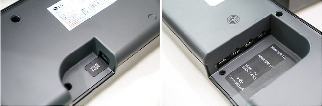 후면은 전원 및 광디지털 케이블 그리고 HDMI 단자와 전원공급용 USB A타입의 단자가 있어 TV 등 다양한 외부 기기와 연결이 가능하고 가까운 USB 디바이스를 충전 가능합니다. 전류량이 높은 건 아니라 TV 옆의 작은 시계나 충전 사용 시 편리할 것 같습니다. 그 밖에는 벽에 마운트 가능한 나사 홀 등이 있어 기본 포함된 브래킷을 이용 부착이 가능합니다. HDMI 단자 중 eARC/ARC 표기 단자는 TV와 연결 시 사용됩니다.