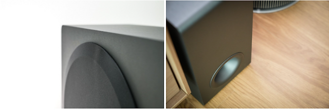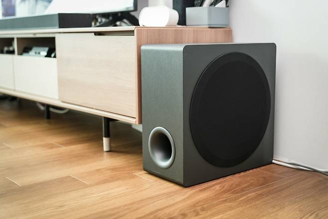 상당히 큰 부피를 차지하는 서브우퍼는 상대적으로 자리를 좁게 차지하는 디자인으로 되어 있어 거실장 옆 작은 공간에도 위치하기 좋습니다.