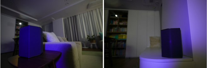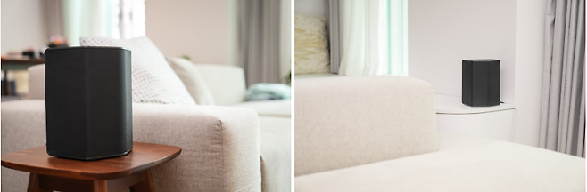 보통 측후방에 위치하는 리어 스피커 1쌍은 각도를 두어 전면으로 2개의 스피커가 상방향 스피커 1개로 이루어져 있습니다. 기존의 홈시어터 시스템을 생각한다면 앰프를 시작으로 서브우퍼 및 여러 스피커를 어디에 배치할지 각각을 케이블로 어떻게 세팅해야 할지 설치부터 많은 어려움이 생겨 웬만큼 오디오에 대한 지식이 없다면 포기하시거나 값비싼 비용을 들여서 설치해도 집안 인테리어를 해치거나 하는 모습을 보이곤 했던 것에 비하면 정말 심플한 구성입니다.