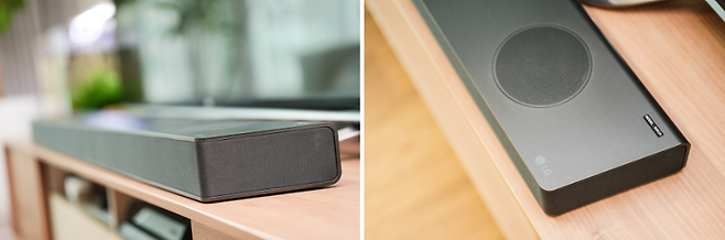 약간 가로로 긴 사다리꼴 디자인으로 모던하고 심플한 느낌을 줍니다. 전면과 측면 부는 부드러운 메쉬 재질 디자인이며, 상 측은 메탈릭 한 표면처리가 되어 있습니다. 이러한 디자인은 TV 바로 하단에 두기 좋으며, 눈에 띄지 않아 주변 인테리어의 조화를 크게 생각하지 않아도 되며 보인다 해도 프리미엄 하면서 모던한 디자인에 어디나 잘 어울리는 타입이라고 볼 수 있습니다. 최근에는 디지털 가전 또한 인테리어와 조화는 필수이기에 이러한 디자인은 인테리어에도 한몫한다고 볼 수 있을 것 같습니다.