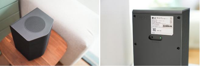 서브우퍼와 리어 스피커의 후면 또한 무선 타입이기 때문에 전원 케이블 단자와 페어링 버튼, 페어링 인디케이터 LED만 있을 정도로 심플한 모습을 보입니다.