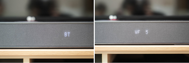 전체적으로 별도의 디스플레이 창 대신 전원을 올리고 조작을 하면 메시 재질 디자인 안쪽에서 위와 같이 쉽게 정보를 보고 조작할 수 있게 되어 있으며, 야간에도 가독성이 매우 좋습니다. 전체 디자인을 해치지 않으면서도 시안성 좋은 부분으로 LG 사운드바의 초기 모델부터 적용된 컨셉이 상당히 디자인적으로 완성도 높게 된 부분입니다.