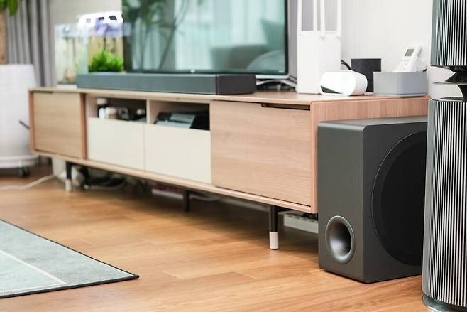 상당히 큰 부피를 차지하는 서브우퍼는 상대적으로 자리를 좁게 차지하는 디자인으로 되어 있어 거실장 옆 작은 공간에도 위치하기 좋습니다.