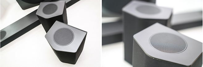 한 쌍의 리어 스피커는 각각 방향성이 다른 3개의 스피커 유닛을 갖고 있는데 그중 하나는 상향 스피커로 입체감 있는 사운드를 주는 역할을 합니다. 하나의 리어 스피커가 3개의 스피커 역할을 하기 때문에 총 6개의 서라운드 스피커 느낌을 받게 됩니다.