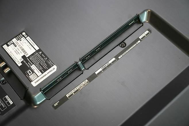 역시나 프리미엄 오디오 브랜드인 메리디안과 협업하여서 좌측에는 로고를 포함하고 있으며, 우측에는 LG 로고가 깔끔하게 들어가 있습니다.