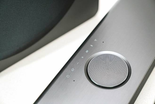 전체적으로 별도의 디스플레이 창 대신 전원을 올리고 조작을 하면 메시 재질 디자인 안쪽에서 위와 같이 쉽게 정보를 보고 조작할 수 있게 되어 있으며, 야간에도 가독성이 매우 좋습니다. 전체 디자인을 해치지 않으면서도 시안성 좋은 부분으로 LG 사운드바의 초기 모델부터 적용된 컨셉이 상당히 디자인적으로 완성도 높게 된 부분입니다.