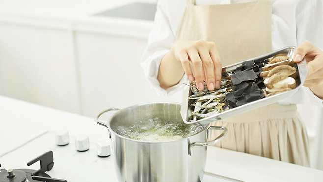 시판 사골 대신 멸치와 다시마, 또는 표고버섯으로 우려낸 천연 육수는 감칠맛은 충분하면서도 나트륨과 인 부담이 적다.