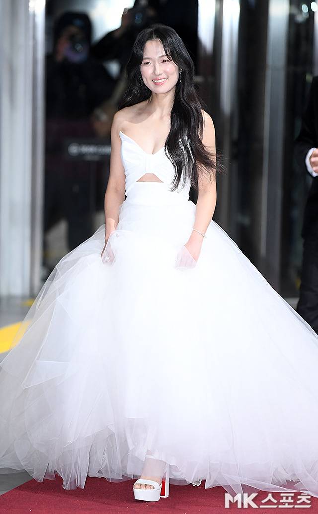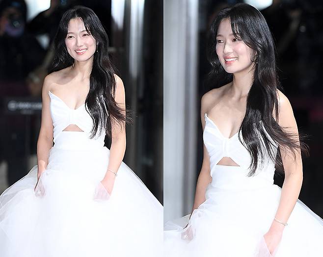 김혜윤은 화이트 튜브탑 드레스를 착용하며 청순한 매력을 극대화했습니다.