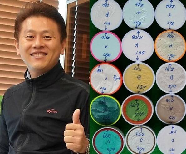 골프 공의 중심 축을 잡아주는 기계 ‘볼 닥터’를 개발한 것을 시작으로 골프공까지 만들게 됐습니다. 코어가 치우치지 않아 중심이 제대로 선 밸런스 볼 ‘엑스페론’은 지금까지 미국, 네덜란드, 독일 등에서 1억개 이상 팔렸는데요. 타사 제품에도 밸런스가 맞는 부분이 표시돼 있지만 제조 과정에서 발생할 수 있는 불균형을 고려하지 않은 게 대부분입니다. 저희는 제조 후 무게 중심에서 가장 낮은 곳을 찾은 뒤 정 반대편에 표시했어요. 표시된 부분에 정렬을 맞춰 공을 치면 똑바로 굴러갑니다.