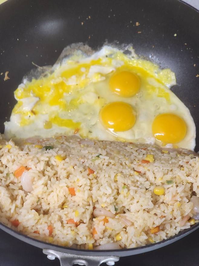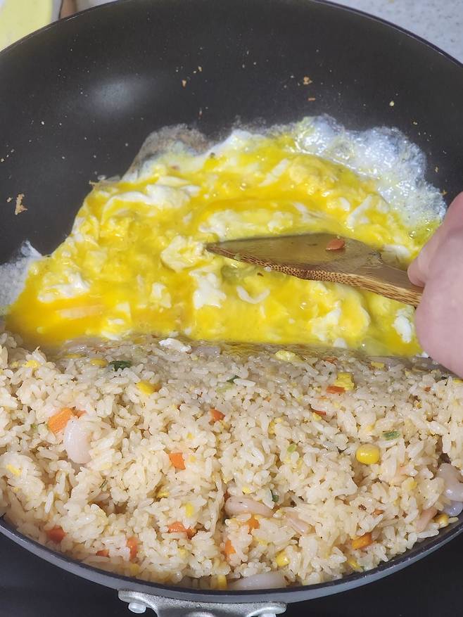 열심히 볶아 주다가 어느 정도 됐다 싶으면 한 쪽에 몰아 놓고, 달걀 넣어 주고요,