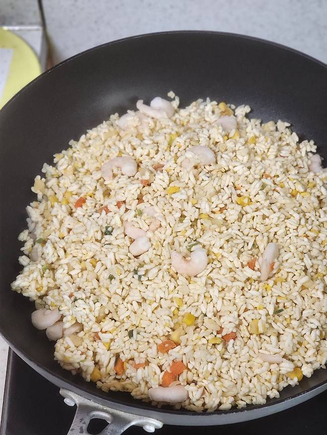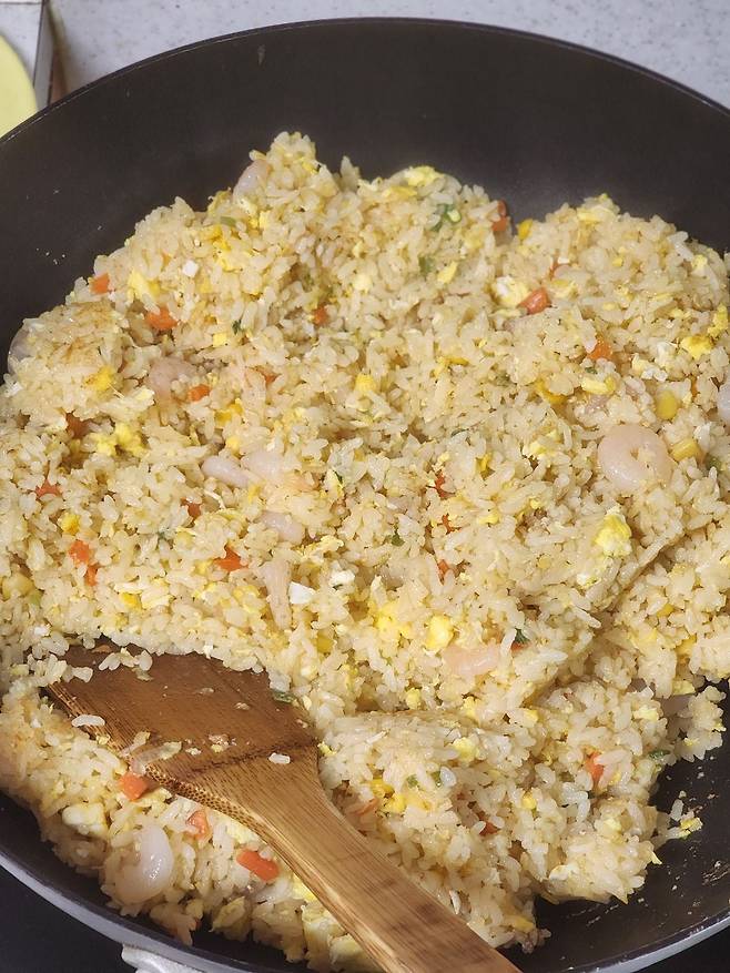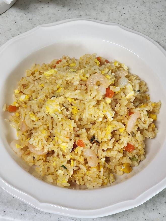 다 됐어요. 달걀 코팅 통새우 볶음밥