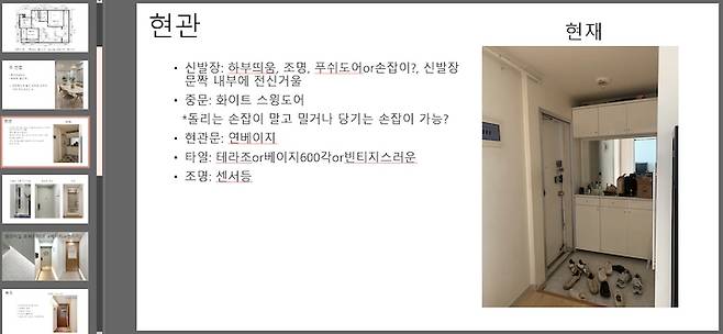 이를 바탕으로 공간 별로 원하는 시공 내역, 자재나 분위기 등을 PPT로 정리해 보았고, 6군데나 되는 턴키 업체에 상담을 다녔습니다.