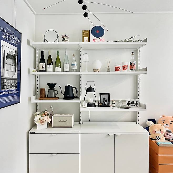 한샘에서 나온 '플롯 책장'인데, 벽을 뚫지 않아도 되는 모듈 선반입니다. 아무리 제 집이더라도 벽에 구멍 뚫는 건 아직은 손이 달달 떨리더라고요.ㅎㅎ;;