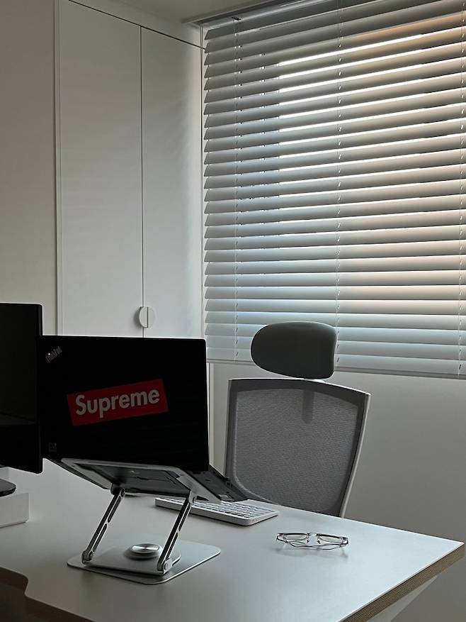 남편이 집에서 장시간 일해야 할 때가 종종 있어서, 예쁘진 않지만 원래 사용하던 모니터와 노트북으로 듀얼 모니터를 갖춰두었고, 모션 데스크와 편안한 의자도 구비했습니다. 저도 이 글을 여기 앉아서 쓰고 있는데 아주 편하네요. 여기 앉아서 마샬 스피커로 음악을 들으면서 일을 하면 일이 아주 잘 된답니다!