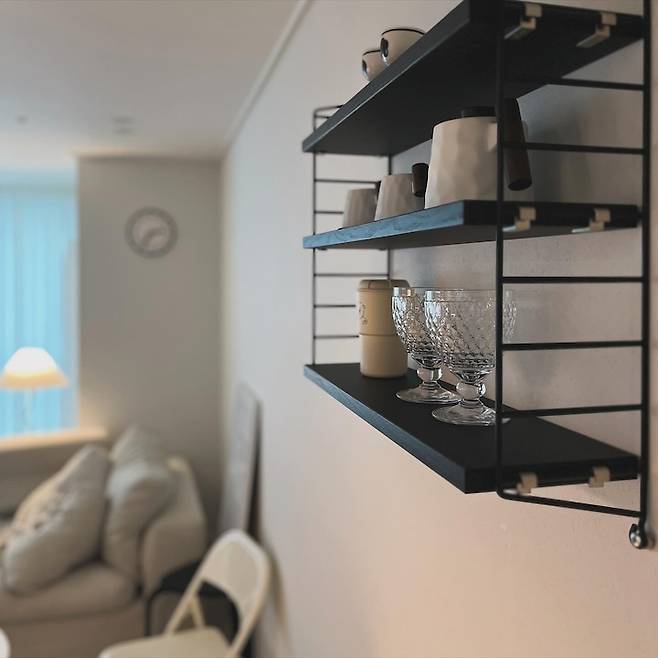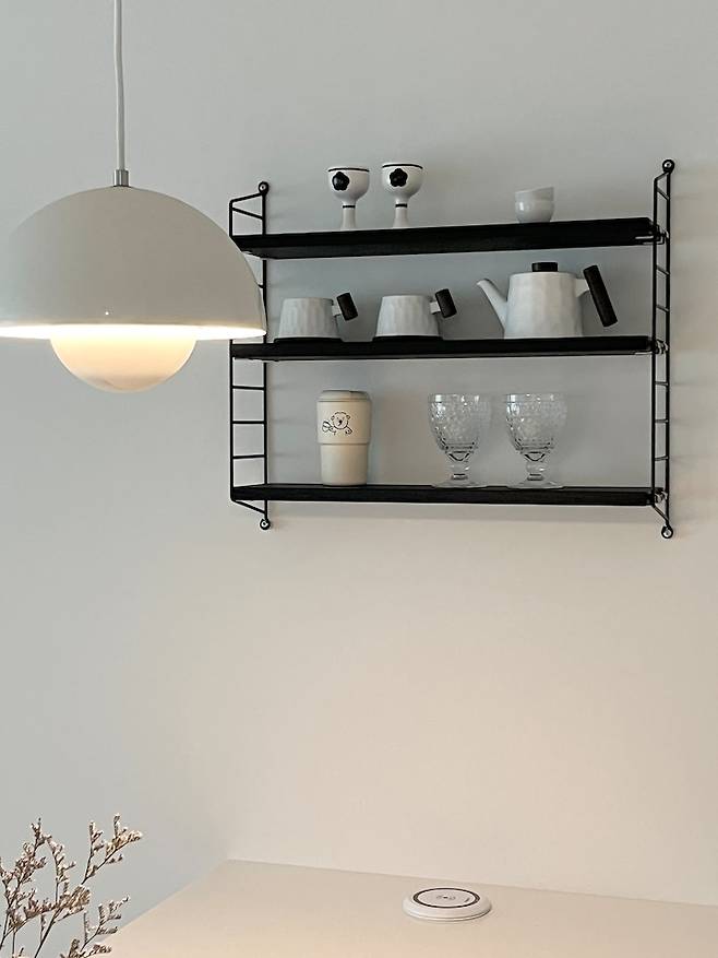매일매일 쉽게 어질러지는 주방이지만, 스트링 선반만큼은 예쁜 컵이나 소품으로 장식하여 소소한 기쁨을 누리고 있어요.