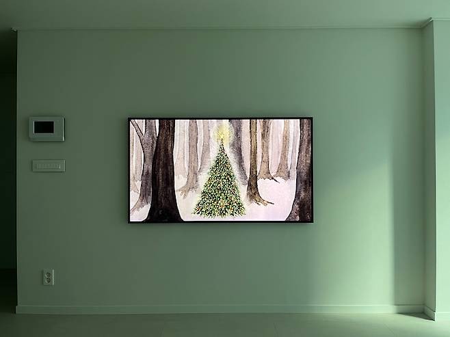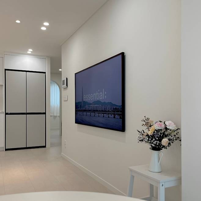 TV는 처음부터 삼성 더프레임 TV를 사고 싶다는 생각이 확고했어요. 더프레임 TV의 액자 느낌을 극대화하면서 전선도 깔끔하게 정리하기 위해 가벽을 9~10cm 정도 치고 반매립을 했습니다.