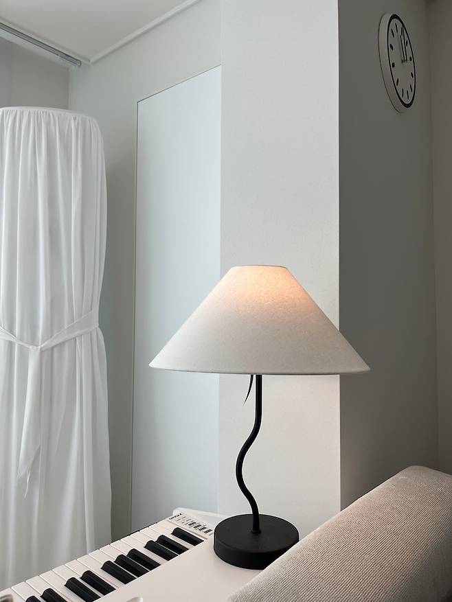 또, 소파 뒤 공간에 키보드를 배치해 보았는데요, 건반이 마침 블랙 앤 화이트 아니겠습니까? 그래서 에프에프 컬렉티브의 fig 조명도 살포시 올려두었는데, 건반과도 너무 잘 어울리지 않나요!