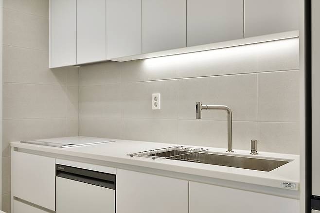 11자 주방은 인테리어 사장님이 제안해 주셨어요. ㄷ자 주방을 하면 코너 쪽에 죽는 공간이 많다고 하시더라고요. 그래서 11자 주방을 추천해 주시면서 오븐레인지, 식세기 자리와 싱크 수전 아래 빼고는 전부 서랍형 수납장을 만들어주셨어요.